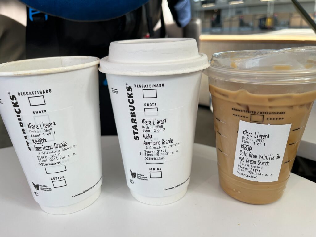 For all those traveling later, know that there are some tasty cafes right outside the B terminal now. Post security no longer contains the only sustenance offerings. The Starbucks by luggage check-in has, in fact, even kept up the important renaming ritual.