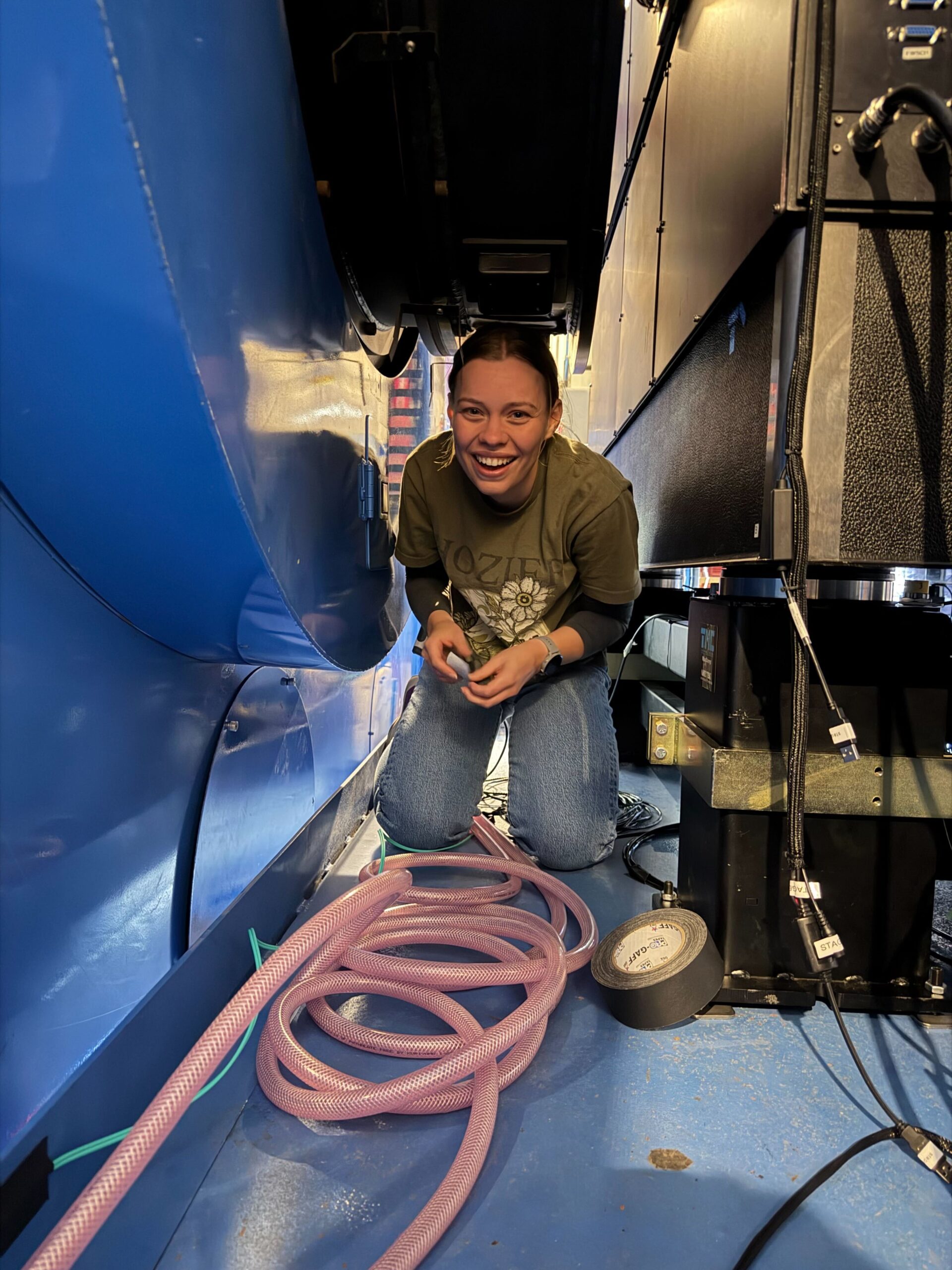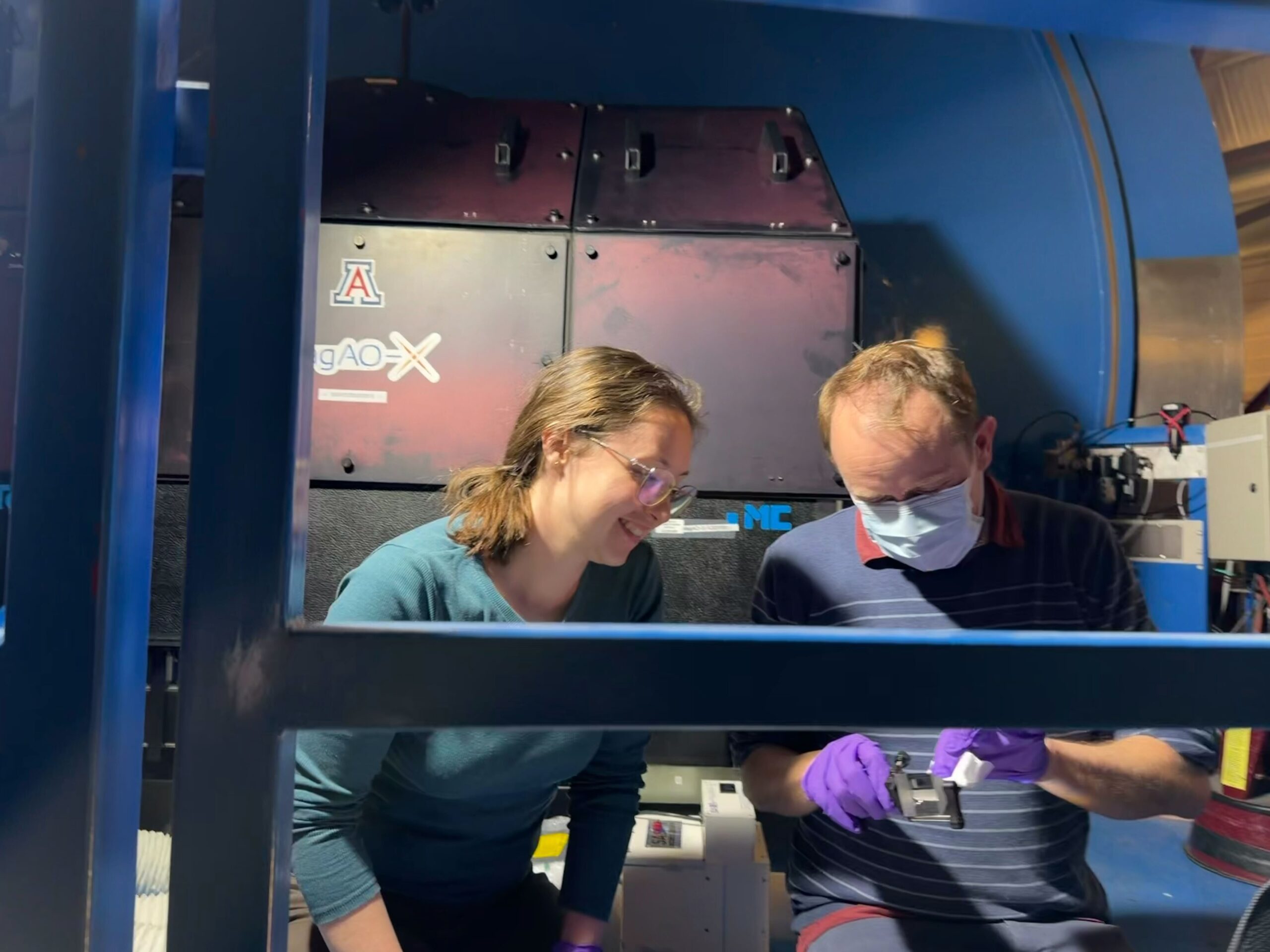 Tiffany and Jay have been hard at work finding extended objects for MagAO-X to image, such as asteroids or satellites. These are tricky for the AO system, but they’re also tricky for the telescope which can no longer follow the well calculated paths of stars across the night sky, aka sidereal tracking. With the help of our TO Hernán, we were able to center a weather satellite on our acquisition camera. We weren’t able to keep up with it long enough to send through to our science cameras, so there’s more work to be done on the tracking front. Even with our acquisition camera we were able to resolve the solar panels on the 20ft target.