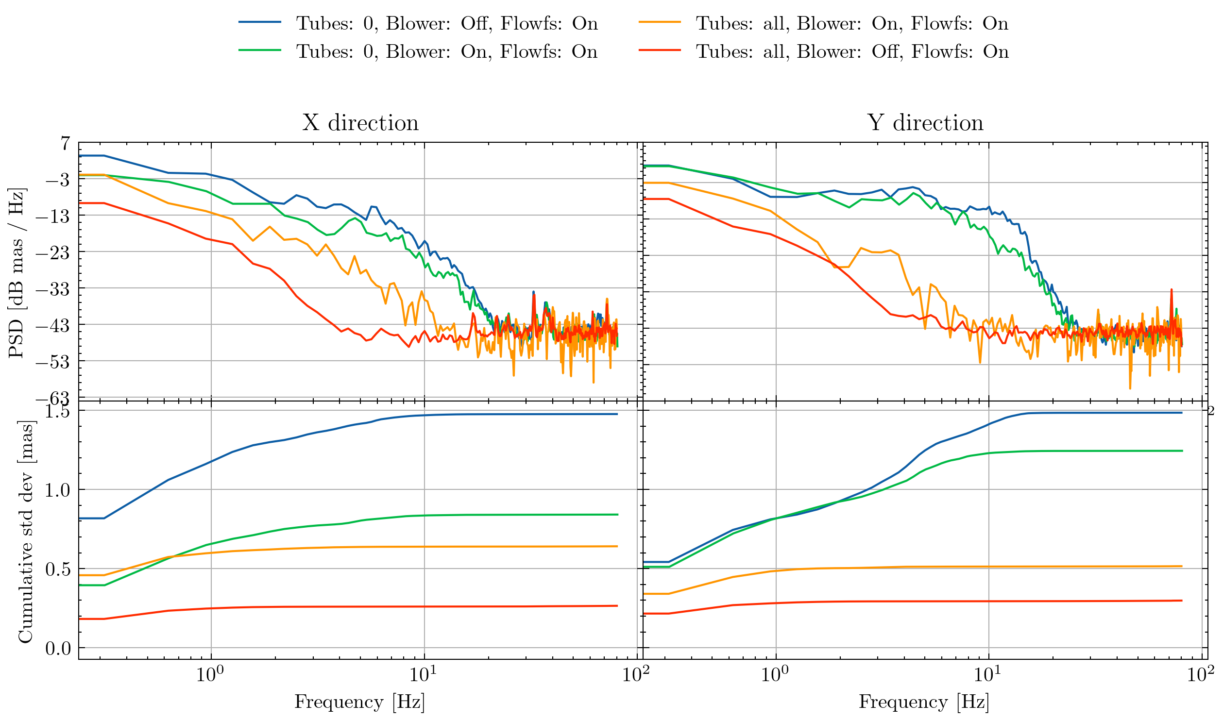 Each column is a different direction. Top row is the power spectrum density, bottom row is the cumulative standard deviation (square root of integral of PSD up to frequency). Units are in mas assuming 5.98 mas/px. Blue: using or not using FLOWFS doesn’t change much when there is bench seeing (no FLOWFS case not shown for clarity). green/red/orange: both the tubes and the blower status seem to matter, consistent with the blower being the next most dominant turbulence source after area covered by tubes.